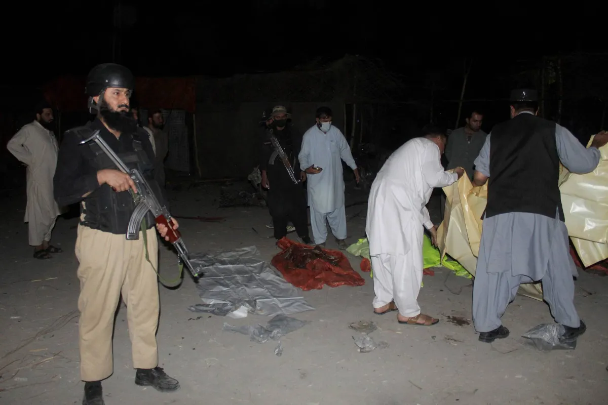 In this picture taken on September 18, 2025, security personnel stand beside the bodies of victims who died in a blast near the Pakistan-Afghanistan border in Chaman. (Photo by Abdul BASIT / AFP)