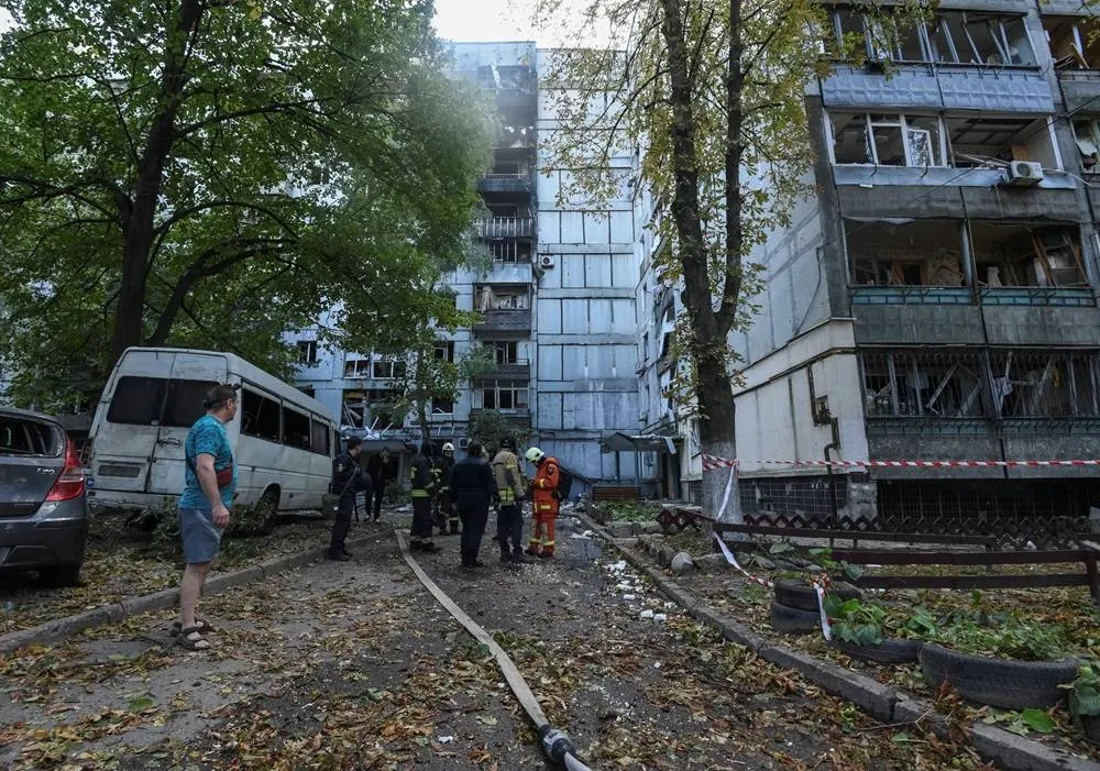 They shared pictures on the Telegram app showing a damaged apartment building with a destroyed roof and smashed windows, people getting medical help, and rescuers working on the site.