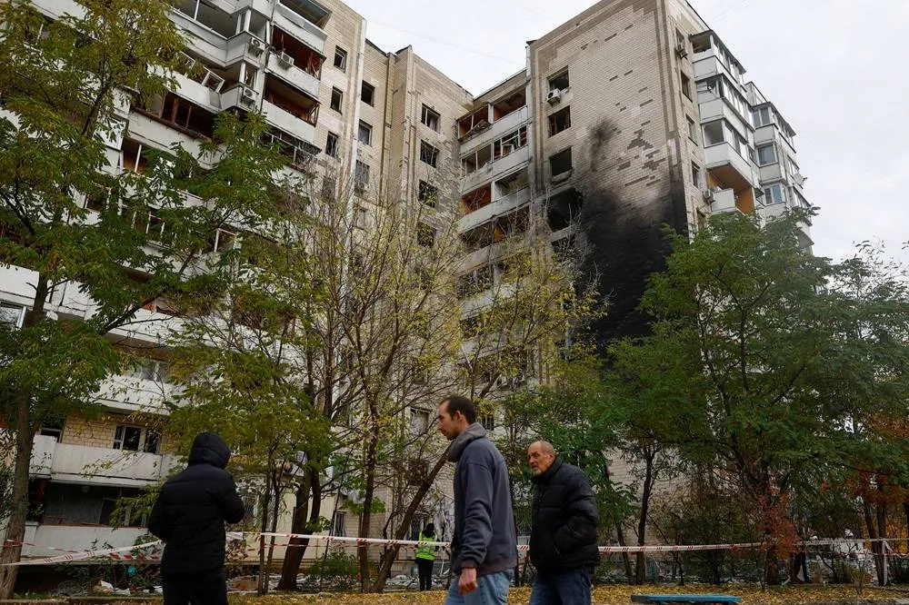 Residents walk in front of an apartment building damaged during an overnight Russian drone strike, amid Russia's attack on Ukraine, in Kyiv, Ukraine October 26, 2025. (Reuters)