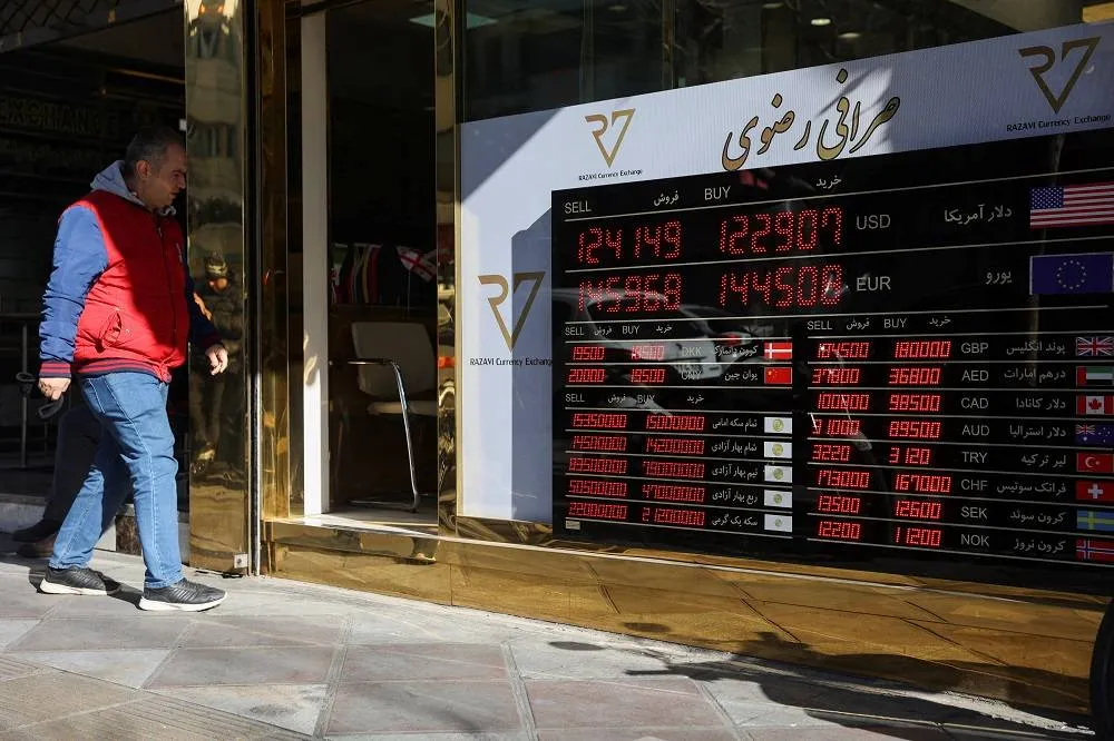 A person walks past a sign at a currency exchange, as the value of the Iranian rial drops, in Tehran, Iran, December 30, 2025. Majid Asgaripour/WANA (West Asia News Agency) via Reuters