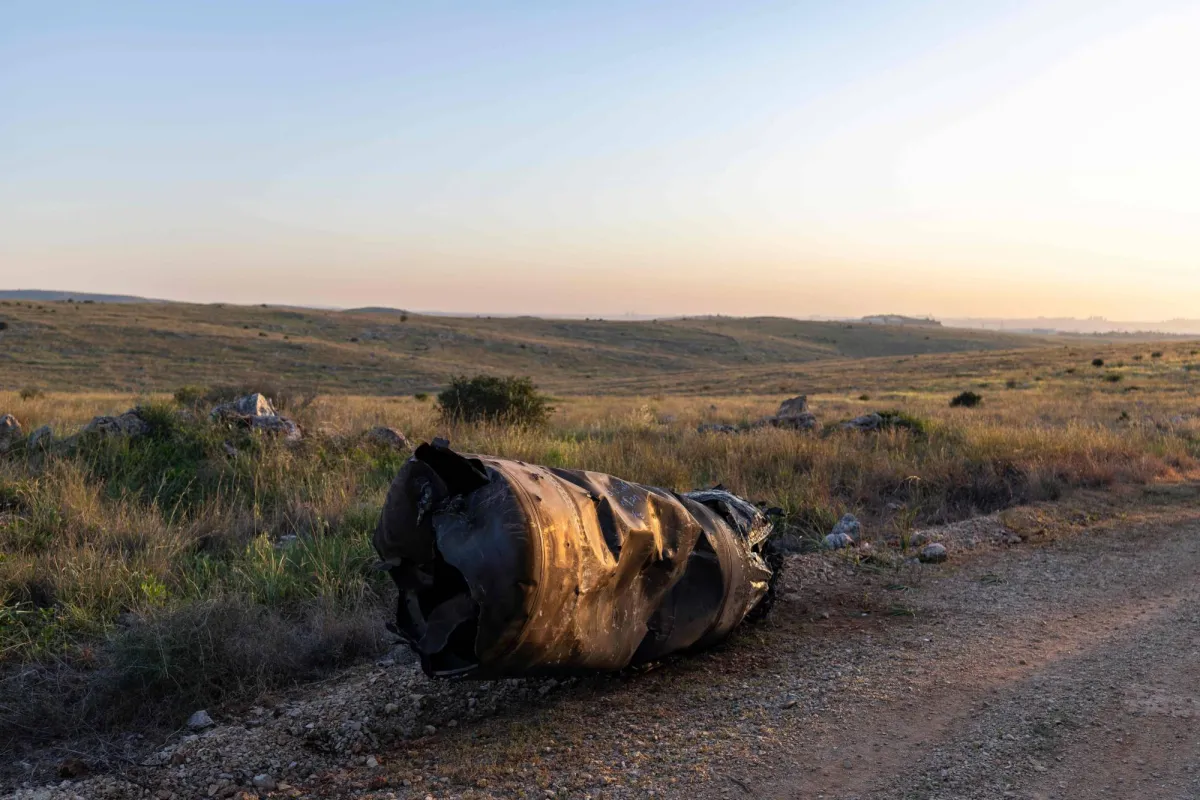 A fragment of an Iranian missile is pictured on the outskirts of Israel's central city of Elad on March 10, 2026.  (Photo by Ilia YEFIMOVICH / AFP)
