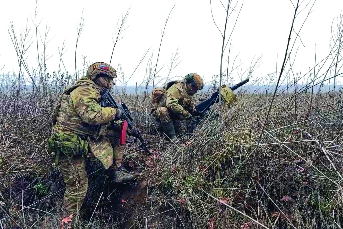 In this image made from video provided by Russian Defense Ministry Press Service on Tuesday, March 31, 2026, Russian soldiers prepare to fire a grenade launcher towards Ukrainian positions on an undisclosed location in Ukraine. (Russian Defense Ministry Press Service via AP)
